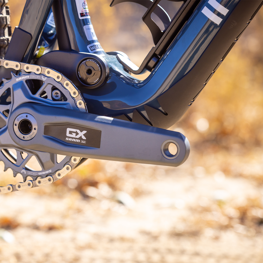 FRAME | Full carbon fiber front and rear triangle utilizing an optimized carbon layup for the trail category. Features fully-guided internal cable routing, alloy top link with integrated flip chips to adjust geometry, titanium hardware, ISCG-05 tabs, and a threaded bottom bracket. Universal derailleur hanger (UDH) and quick-release rear axle (148mm Boost hub spacing) |