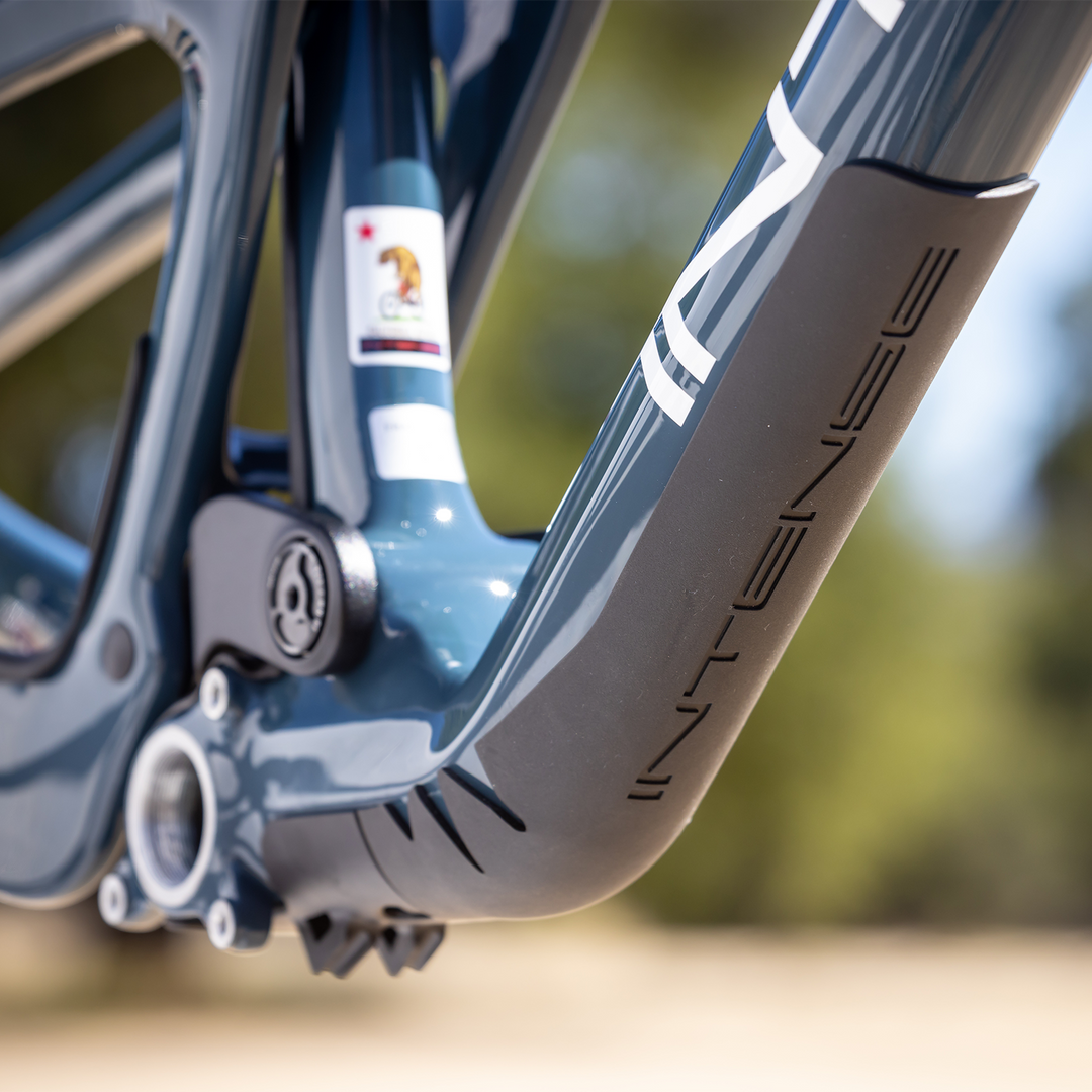 FRAME | Full carbon fiber front and rear triangle utilizing an optimized carbon layup for the trail category. Features fully-guided internal cable routing, alloy top link with integrated flip chips to adjust geometry, titanium hardware, ISCG-05 tabs, and a threaded bottom bracket. Universal derailleur hanger (UDH) and quick-release rear axle( 148mm Boost hub spacing) |